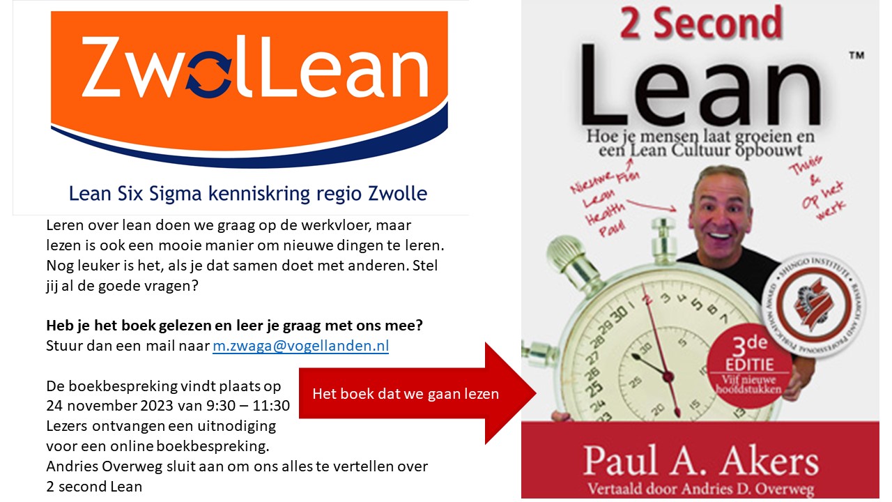Op 24 november van 9:30 tot 11:30 bespreken we het boek Two Second Lean van Paul Akers. Andries Overweg heeft dit boek voor ons vertaald naar het Nederlands en is ook aanwezig bij de boekbespreking. Het boek is te lezen in niet meer dan drie uur en geeft een energy boost aan jouw lean-ontwikkeling. Als je mee wilt lezen en leren, stuur dan een mail naar Mariëlle Zwaga m.zwaga@vogellanden.nl en dan zorgt zij dat je een teamslink ontvangt voor de boekbespreking.