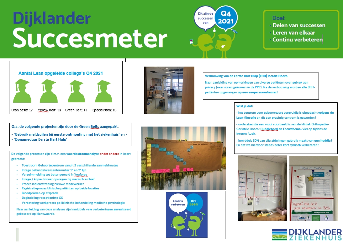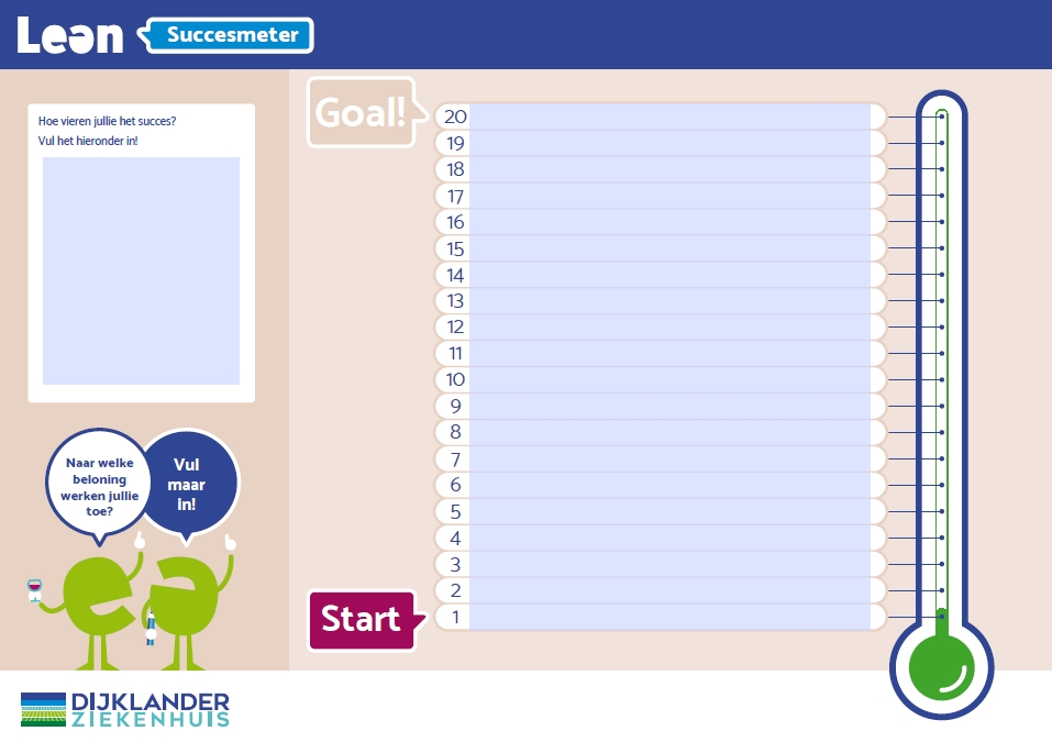 In Dijklander ziekenhuis delen we successen en voorbeelden op de Lean pagina op Intranet. Daarnaast publiceren we elk kwartaal een 'Dijklander Succesmeter'; een poster als nieuwsbrief met een overzicht van de verbeteringinitiatieven van dat moment. Afdelingen/teams kunnen hun verbeterresultaten ook visualiseren op een Succesmeter-poster en/of in een digitale versie van de Succesmeter. Daarnaast kan het op Zenya worden opgeslagen en geborgd.